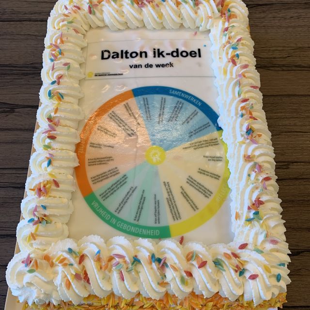 Tijdens de daltonstudiedag van donderdag 24 november hebben de leerkrachten gewerkt aan de 'ik-doelen' van de leerlingen. Om te vieren dat we voor ieder leerjaar een prachtige 'ik-doelen kaart' hebben waarmee de leerlingen kunnen aftekenen hoe hun ontwikkeling verloopt hebben tijdens de koffie een heerlijke taart gegeten.